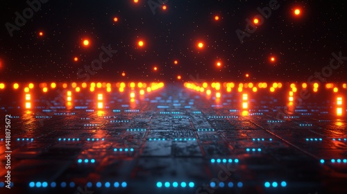 Futuristic digital pathway with glowing lights. A pathway of glowing circuits and lights, creating a technological and sci-fi ambiance. Abstract design with orange and blue lights