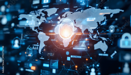 Futuristic Digital Security Concept with Fingerprint Scanner and Global Map