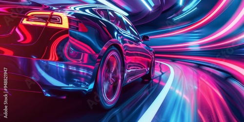 Futuristic electric car with neon accents driving through a tunnel with vibrant lights and copy space