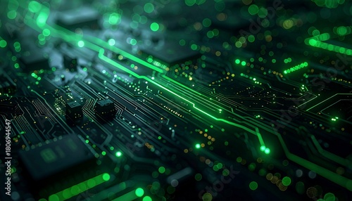 Futuristic electronic circuit board illuminated with vibrant green energy details