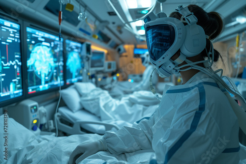 Futuristic emergency room equipped with modern technology, screens, personal protection suits and patient beds. Doctor caring for a patient lying in a bed wearing white protection suit and mask