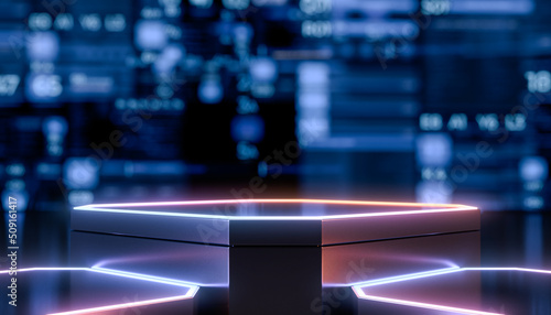 Futuristic empty Stage For Product Presentation. Podium Or Pedestal with neon lights product stage. Future concept background. 3D Rendering.