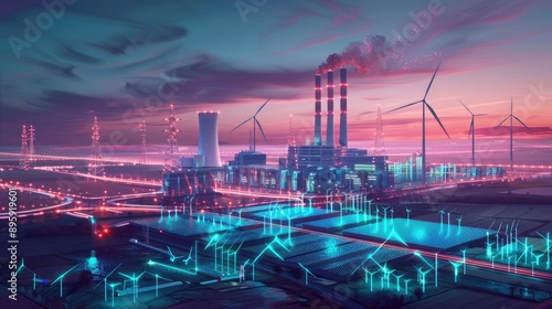 Futuristic energy plant with renewable energy sources and smart grids