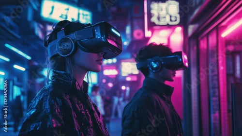 Futuristic Entrepreneurs in Retro Neon City Utilizing VR Headsets Amidst Midday Glow and Silhouettes Evoking Vision of Tomorrow