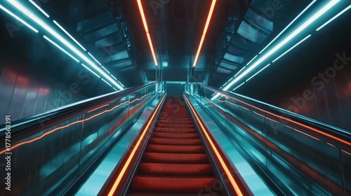 escalator, neon, light, futuristic, modern, architecture, urban, city, transport, movement, technology, abstract, design, interior, building, bright, vibrant, glowing, electric, energy, dynamic, perspective, symmetry, line, geometric, step, stair, upward, downward, motion, speed, future, innovation, digital, science fiction, illumination, colourful, blue, orange, red, dark, contrast, smooth, sleek, clean, empty, public