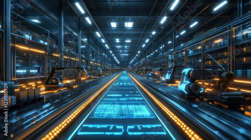 futuristic, technology, factory, industrial, automation, robotic, manufacturing, digital, datum, network, science, innovation, blue, orange, dark, light, glow, line, path, corridor, tunnel, long, narrow, machinery, equipment, modern, advanced, high technology, computer, electronic, electric, system, process, control, production, industry, future, progress, development, abstract, concept, design, three-dimensional, rendering, illustration, graphic