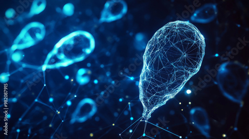 Futuristic fertilization concept: glowing polygonal sperm and egg cells on dark blue. Wireframe design.