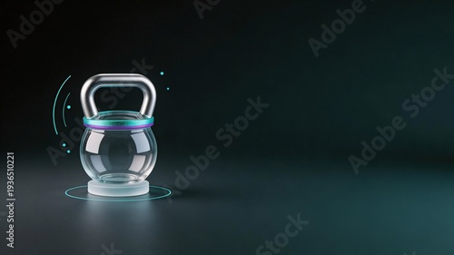 Futuristic glass kettlebell with holographic accents displayed in dark studio