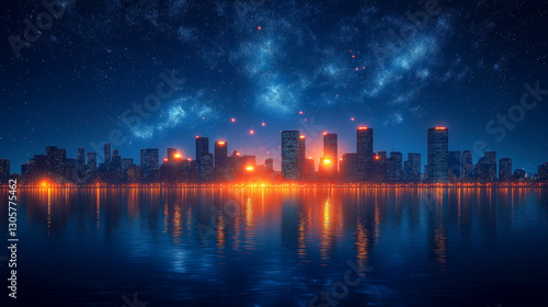 Futuristic glowing city skyline lights up the night with reflective water and starry sky