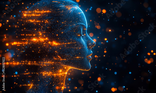 digital, female, face, profile, glowing, blue, orange, light, particle, abstract, datum, flow, technology, artificial, intelligence, futuristic, innovation, tech, ai, human, cyber, computer, network, science, electronic, virtual, cyberspace, communication, modern, connection, abstract art, digital artwork, visualisation, hologram, three-dimensional, bright, neon, smart, algorithm
