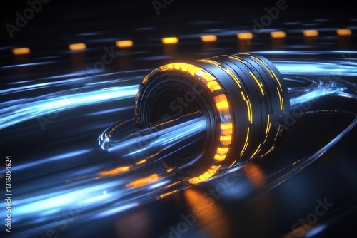 futuristic, glowing, ring, blue, light, trail, dynamic, abstract, composition, tech, innovation, concept, design, motion, energy, stream, flow, speed, technology, background, modern, bright, graphic, art, illustration, cyberspace, digital, connection, network, datum, communication, element, shape, pattern, surface, texture, dark, black, orange, neon, rendering, artificial, intelligence, future, science, fiction, virtual
