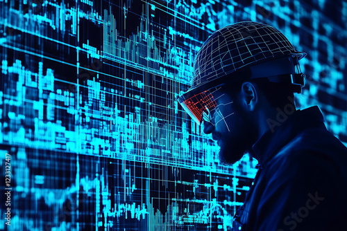 Futuristic glowing wireframe of an engineer wearing AR glasses, showcasing advanced technology and innovation in engineering