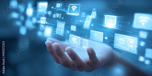 Futuristic Hand Holding Multiple Digital Devices and Icon Representations of Connectivity and Communication Technologies in a Vibrant Blue Background