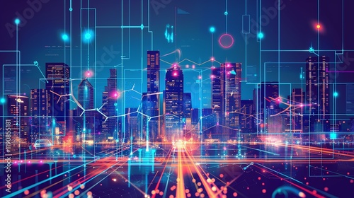 Futuristic high tech cityscape at night featuring glowing skyscrapers neon lights and a complex network of digital infrastructure and transportation A modern