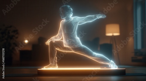 hologram, figure, yoga, pose, dynamic, technology, fitness, athlete, light, movement, energy, health, wellness, design, meditation, silhouette, exercise, balance, form, space, relaxation, lifestyle, training, concentration, art, modern, abstract, studio, glowing, illumination, character, creative, display, artistic, atmosphere, tranquil, indoor, home, peaceful, motion, representation, visualisation, perspective, innovation