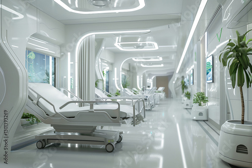 Futuristic Hospital Room. Clean White Beds and Green Plants with Healthcare Monitors for Patient Treatment