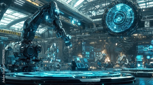 robotic, automation, technology, futuristic, machinery, industry, engineering, workspace, factory, production, innovation, design, digital, computer, environment, assembly line, neon, screen, equipment, tech, science fiction, industrial, machine, advanced, circuitry, workshop, assembly line