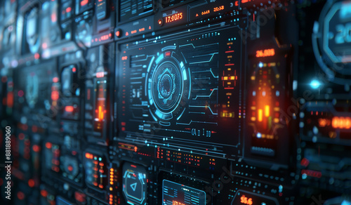 Futuristic interface with glowing blue and red displays. Generative AI