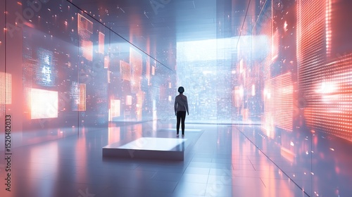 interior, futuristic, person, digital, display, city, view, architecture, technology, modern, space, design, visualisation, wall, panel, light, perspective, empty, room, hallway, contemporary, abstract, virtual, screen, showcase, exhibition, datum, information, innovation, concept, art, visual, image, illustration, background, display, urban, city landscape