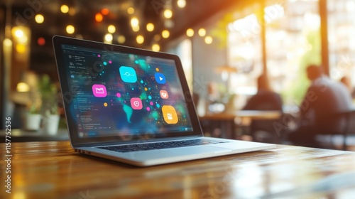 Futuristic Laptop Displaying Colorful Social Media Icons and Data Analytics in a Cozy Cafeteria Setting Filled with Warm Lighting and Lively Atmosphere