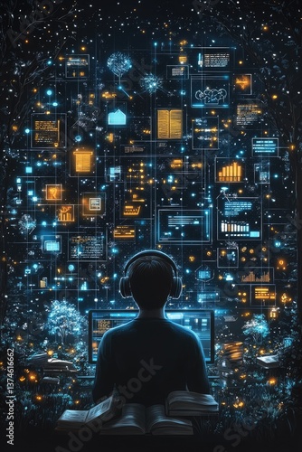 futuristic, learning, journey, digital, technology, cyber, innovation, virtual, datum, network, screen, earphones, education, analysis, graph, tree, night, star, interface, coding, programming, visualisation, information, research, connected, intelligence, screen, light, study, book, exploration, science fiction, interaction, nerve cell, conceptual, future, complexity, man, cognition, progress, modern