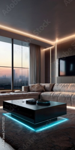 Futuristic living room setup with a smart home entertainment system, sleek tech gadgets, and ambient LED lighting for a modern, high-tech atmosphere
