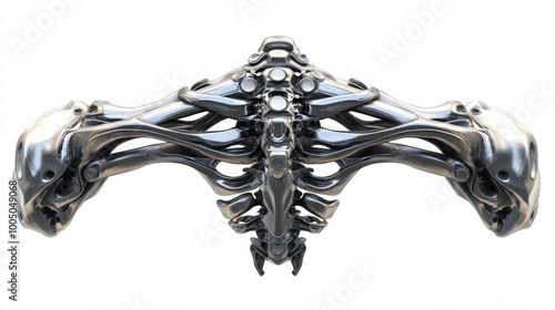 Futuristic metallic sculpture with intricate detailing on a white isolate background.