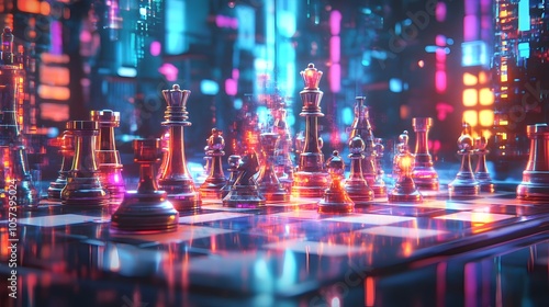 chess, futuristic, transformation, geometric, shape, glowing, neon, holographic, science fiction, sleek, minimalist, city, platform, skyscraper, game, abstract, digital, technology, strategy, competition, depth, complexity, future, fantasy, surreal, colours, light, pattern, structure, design, architecture, urban, environment, nano, algorithm, shifting