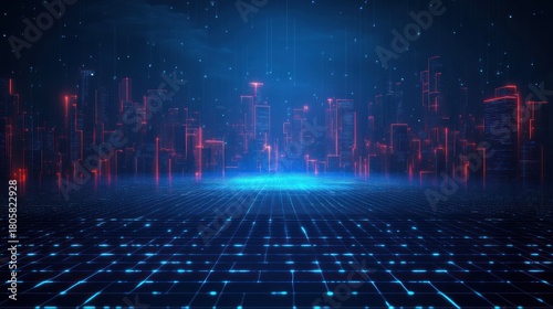 futuristic, digital, city, skyline, neon, grid, holographic, glowing, blue, red, building, hologram, virtual, cyberspace, datum, network, light, night, metropolis, urban, technology, high technology, matrix, wireframe, line, illumination, silhouette, panoramic, electronic, abstract, science fiction, futurism, atmospheric, mystery, city landscape