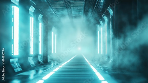 corridor, futuristic, neon, light, science fiction, tunnel, path, passage, hallway, glowing, blue, teal, water, bright, dark, smoke, fog, vapour, mystery, atmosphere, digital, technology, render, three-dimensional, art, design, abstract, modern, industrial, steel, metal, structure, line, light, electric, energy, dreamy, fantasy, space, aesthetic