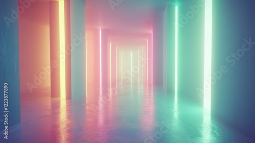 neon, corridor, light, pastel, abstract, background, glowing, illumination, architecture, futuristic, modern, design, interior, wall, column, glow, bright, colours, fantasy, vibrant, reflective, smooth, surface, empty, space, atmosphere, room, light, tunnel, pathway