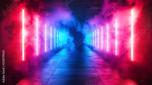 futuristic neon laser corridor with vibrant red and blue smoke effects