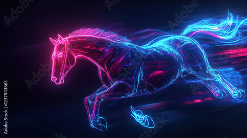 hologram, racehorse, neon, futuristic, blue, pink, digital, motion, technology, glowing, animal, art, design, vibrant, speed, light, abstract, energy, modern, creative, illustration, fantasy, silhouette, dark, visual
