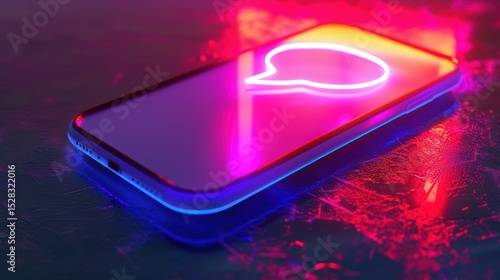 Futuristic neon smartphone with glowing chat icon on vibrant surface