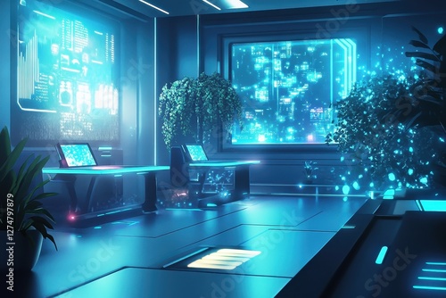 futuristic, office, space, holographic, screen, glowing, plant, technology, interior, design, blue, cyan, lighting, digital, datum, visualisation, workstation, desk, computer, monitor, potted, greenery, leaf, cyber, artificial, intelligence, innovation, workspace, corporate, modern, sleek, elegant, stylish, clean, presentation, display, window, city, network, communication, interface, programming, code, software, neon, light, floor