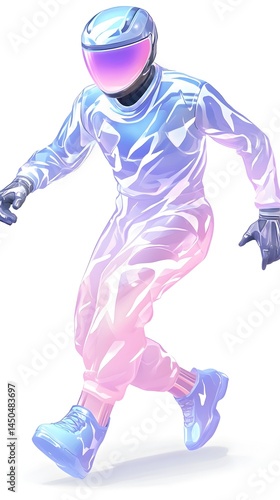 Futuristic racer in translucent, pastel-colored suit and helmet, dynamic pose