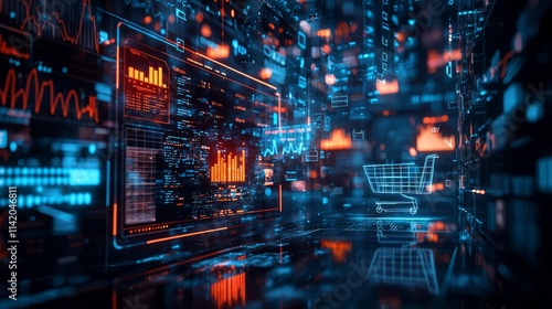 futuristic, retail, platform, vibrant, three-dimensional, tablet, display, glowing, shopping, cart, interactive, trend, graph, emerging, screen