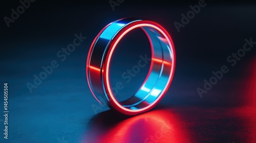 ring, futuristic, neon, light, glowing, vibrant, colourful, illuminated, metal, circular, modern, design, technology, abstract, shape, geometric, illumination, red, blue, colours, three-dimensional, rendering, illustration, digital, object, art, graphic, image, lighting, background, dark, contrast, bright, fashion, accessory
