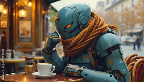 Futuristic Robot Enjoying Coffee at an Outdoor Cafe