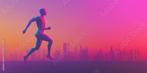 running, runner, athlete, man, human, figure, silhouette, leap, jump, city, city landscape, sunset, sunrise, horizon, urban, landscape, building, skyscraper, architecture, modern, futuristic, dynamic, motion, speed, energy, power, progress, achievement, success, hope, future, determination, motivation, digital, art, design, graphic, style, abstract, geometric