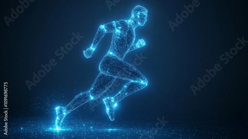 digital artwork, futuristic, technology, sport, wellness, motion, speed, athlete, silhouette, abstract, wireframe, network, male, blue, navy blue, modern, digital, illustration, graphic design, fitness, health, active, exercise, design, innovation, future, contemporary, abstract design, gym, activewear, energetic, vector graphics, closeup, graphic elements, dynamic, high technology, neon, body, bod, physical exercise