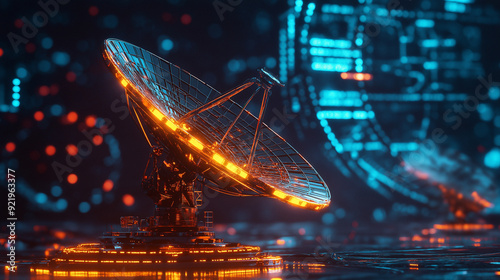 satellite dish, futuristic, glowing, digital, technology, communication, network, datum, signal, dish, antennae, tech, cyber, innovation, connection, broadcasting, science fiction, light, space, satellite, blue, orange, electronic, transmission, modern, high technology, cyberspace, data transfer, global, science fiction