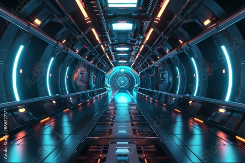 Futuristic Sci-Fi spaceship interior corridor with blue and orange neon lights. Concept of space travel, technology, and the future.