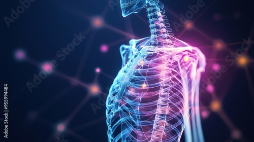 Futuristic skeletal scan in vibrant holographic colors, 3D CT imaging, medical technology focus