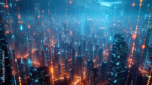 Futuristic smart city at night, tall buildings with communication network, abstract energy lines on cityscape background. Concept of connect, iot, future, digital wireless technology