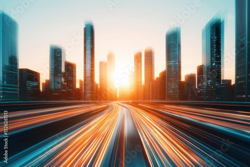 Futuristic smart city skyline at sunrise, with glowing digital light trails symbolizing fast data transfer and advanced connectivity