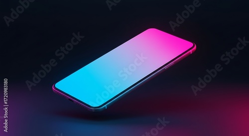 Futuristic smartphone with a glowing neon screen reflecting blue and pink light on a dark background.