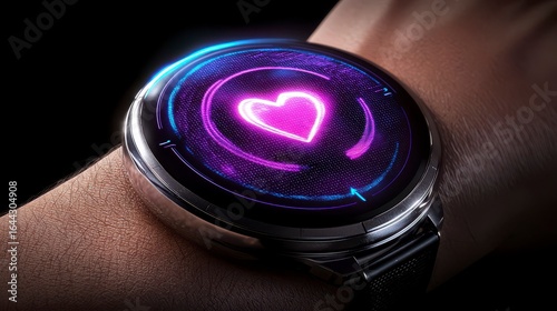 Futuristic smartwatch displaying a vibrant heart rate monitor, showcasing advanced technology and health monitoring features on a wrist.