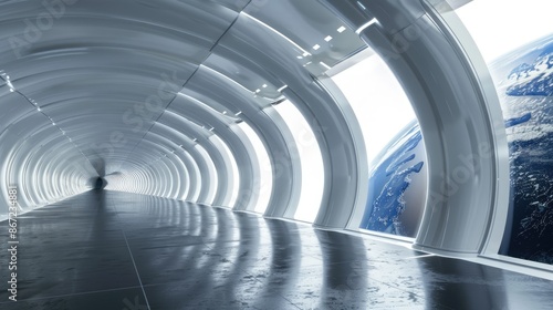 space, station, corridor, futuristic, window, earth, view, white, long, large, blue, grey, light, bright, clean, modern, geometric, abstract, design, architecture, interior, metal, shiny, smooth, curved, circular, reflective, floor, wall, ceiling, empty, minimal, sterile, science, fiction, technology, travel, galaxy, planet, astronomy, universe