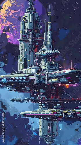 Futuristic space station in orbit with galaxy backdrop, showcasing advanced technology and interstellar travel.